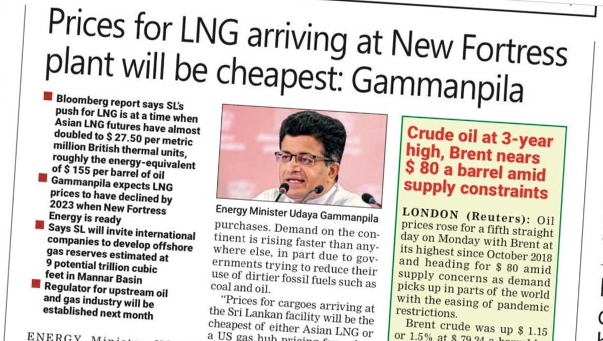 Udaya Gammanpila, Minister of Energy has stated that the price of gas in Sri Lanka will come down due to the construction of the LNG terminal in Sri Lanka by New Photore Energy Company based in New York, USA.
