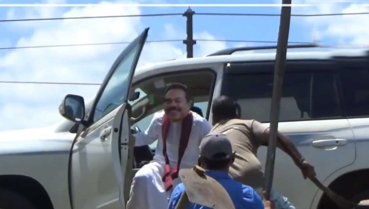 Protesters protested and act violently against a man dressed as Prime Minister Mahinda Rajapaksa during a farmers’ protest in the Rambewa area in Anuradhapura.