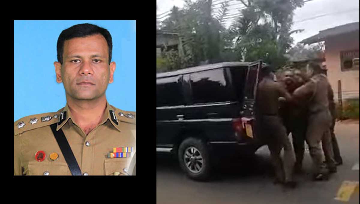 The incident took place on the Kiriella road in Ratnapura. The senior police officer tries to take him away from the police jeep by beating him up, saying that the car was speeding.