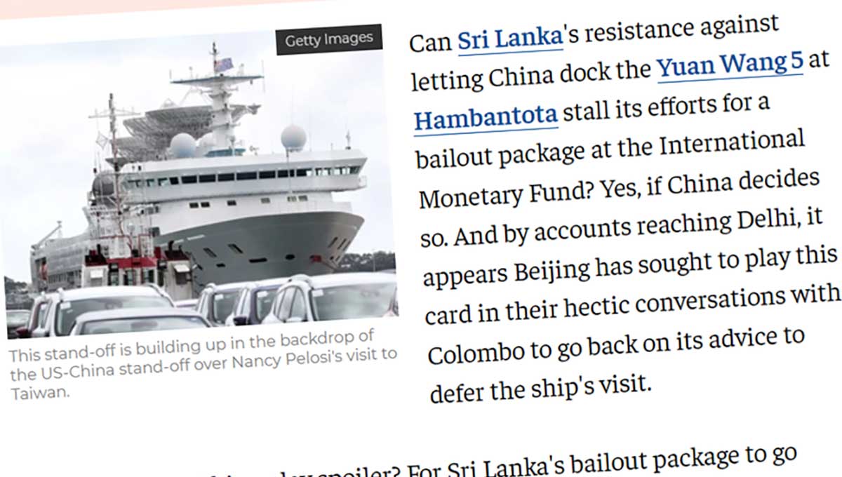 The Economic Times newspaper reports thurtal of the Chinese Yuan Wang 5 ship at Hambantota port, Sri Lanka will have a negative impact on the process of obtaining the expected loan from the International Monetary Fund.