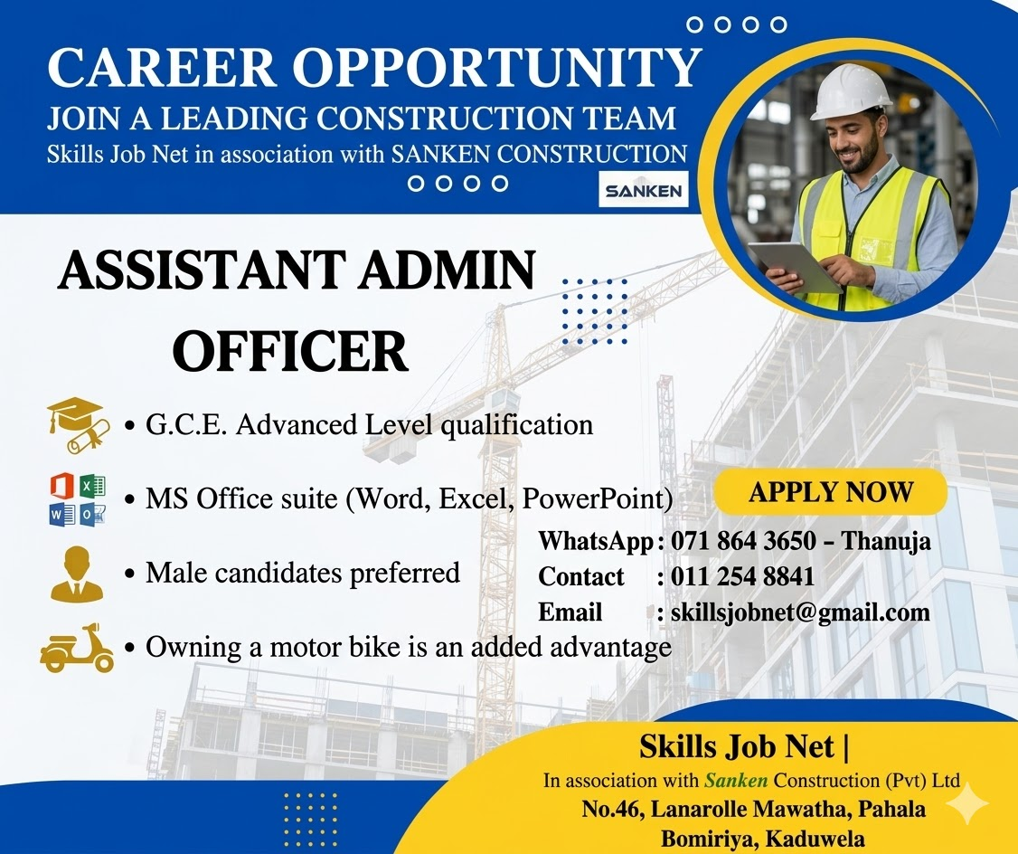 Skills Job Net, in association with Sanken Construction (Pvt) Ltd, is currently seeking a dedicated and organized individual to join their team. This is an excellent opportunity for those looking to build a career within a leading construction company in Sri Lanka.