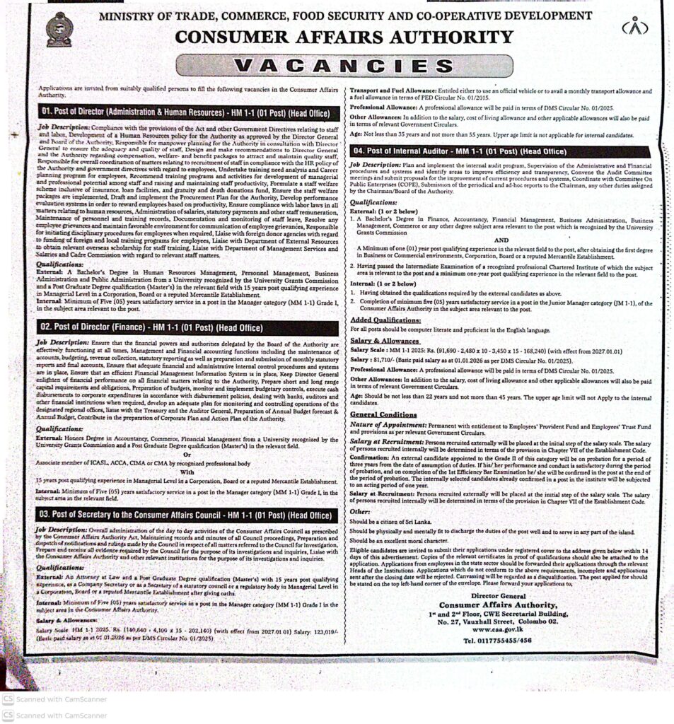 - Address: Director General Consumer Affairs Authority 1st and 2nd Floor, CWE Secretariat Building, No. 27, Vauxhall Street, Colombo 02.